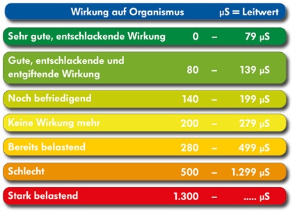 Je niedriger der µS-Wert (µ-Siemens) im Wasser, desto besser die entschlackende und entgiftende Wirkung auf den Organismus.